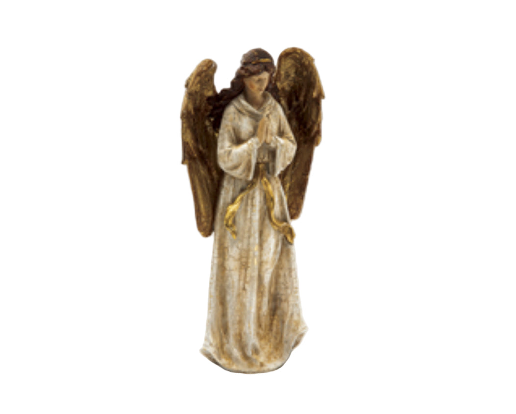 Elegante angelo in resina , decorato sulle ali con i colori dell’oro e un abito avorio, un pezzo classico che renderà un angolo della vostra casa unico. Perfetta idea regalo.