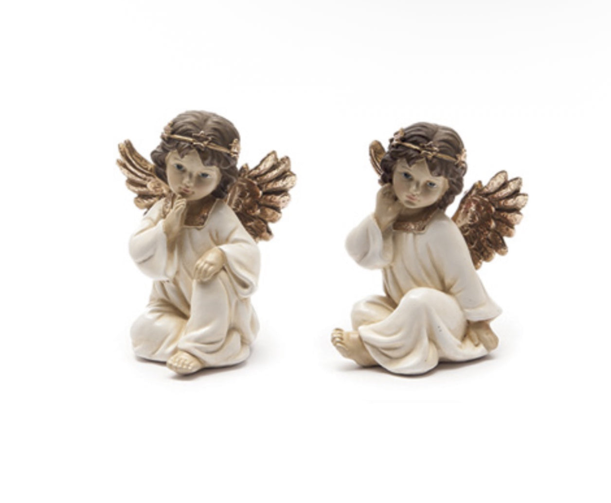Delicati angeli dalle ali dorate seduti e con una ghirlandina di stelline, realizzati in resina e curati nei minimi particolari. Sono disponibili in due varianti e sono perfetti per creare un atmosfera natalizia in un angolo della tua casa.