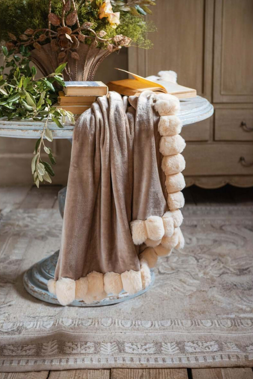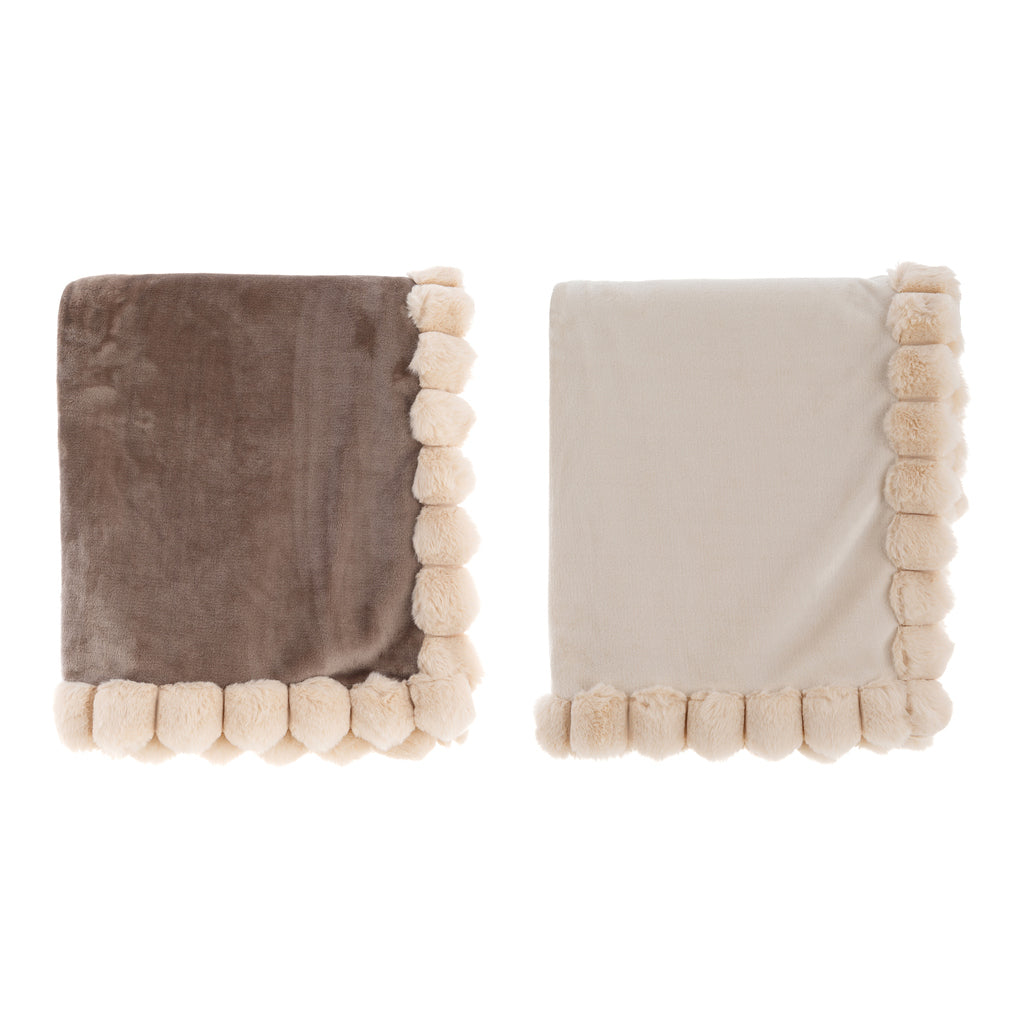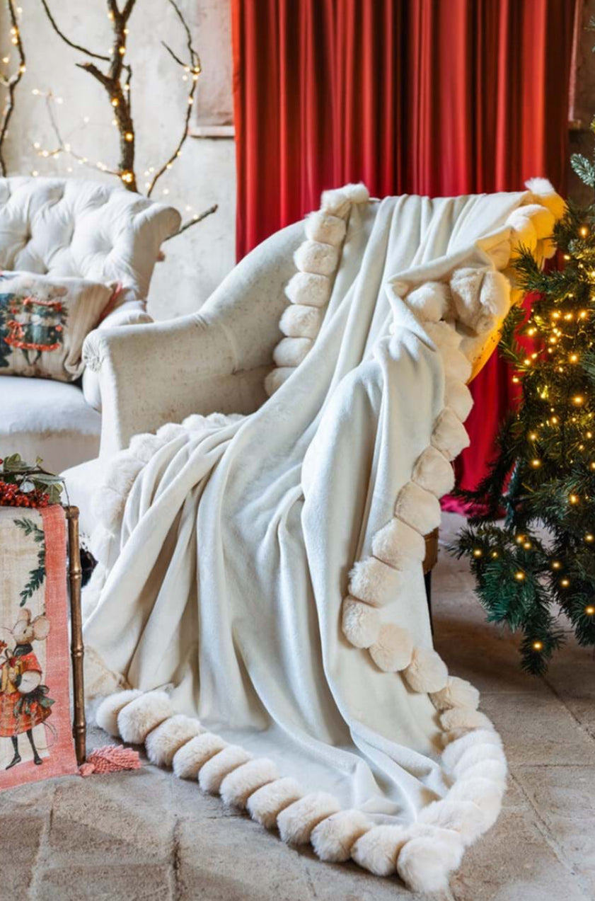 Elegante e raffinato questo plaid, perfetto per arredare la vostra camera da letto ed il vostro divano o da indossare come mantellina. È realizzato in morbidissimo tessuto di microfibra 100%, effetto velluto è impreziosito sul bordo con dei grandi pom pom, di colore chiaro con un peso di 280 gsm.