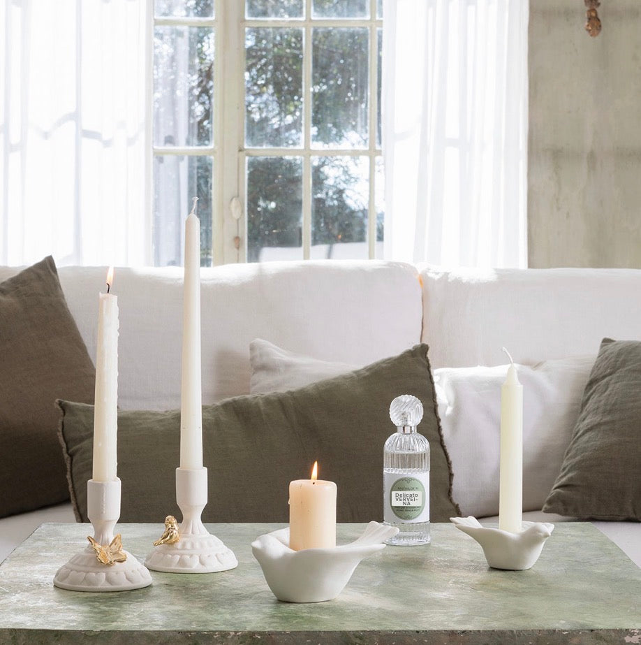 Innamorati di questo irresistibile portacandele in ceramica su un supporto. Adornato uno con un'affascinante farfalla e uno con uccellino di colore oro, porterà un tocco di raffinatezza e delicatezza al tuo arredamento d'interni. Perfetto per candele a stelo.