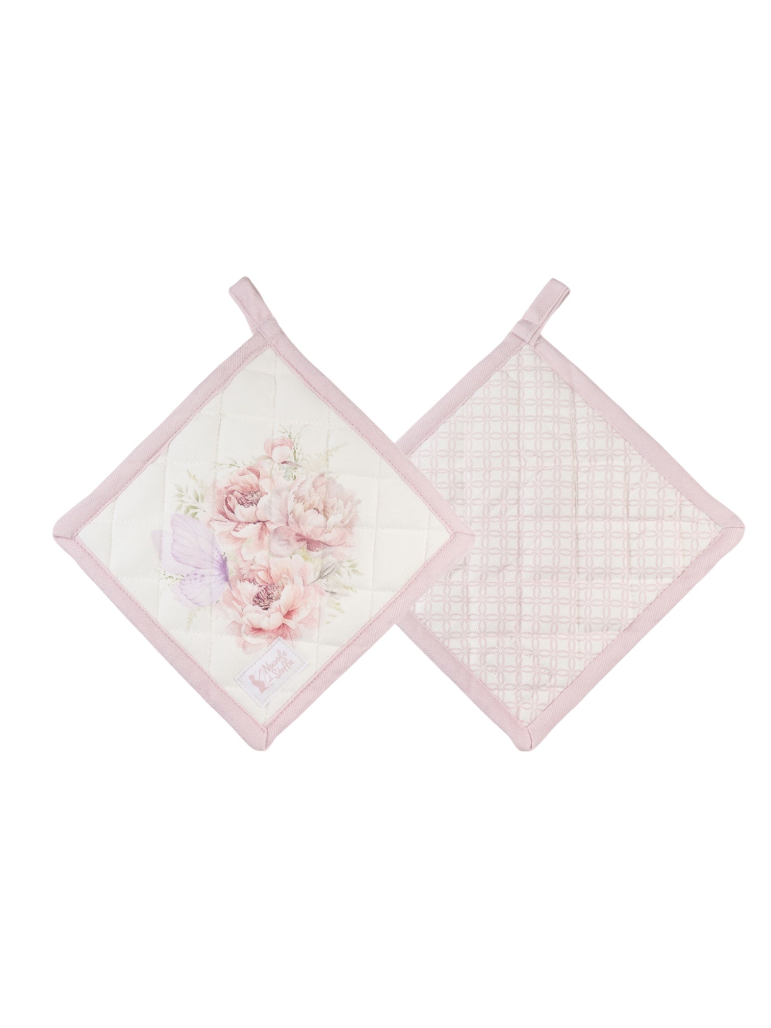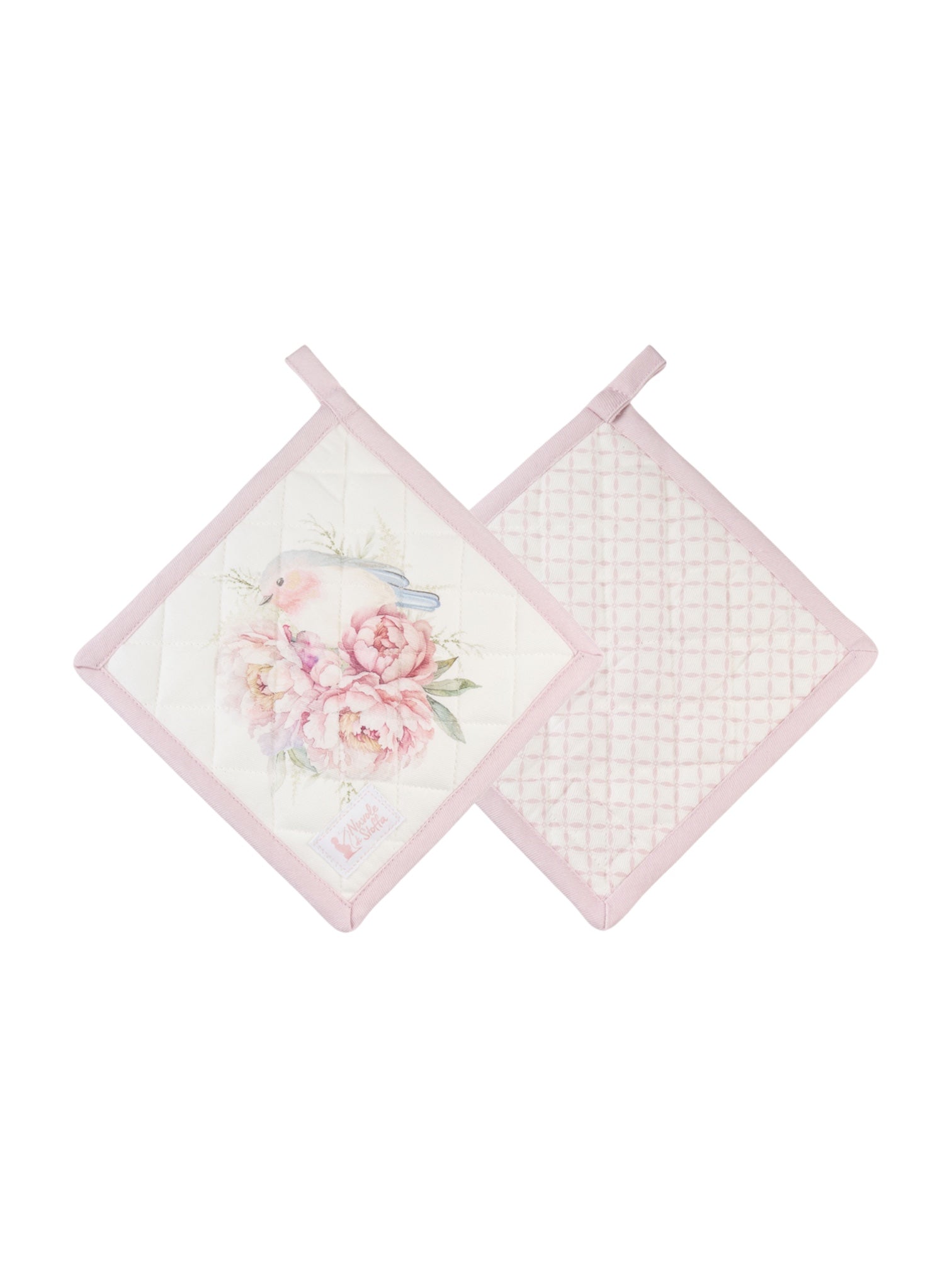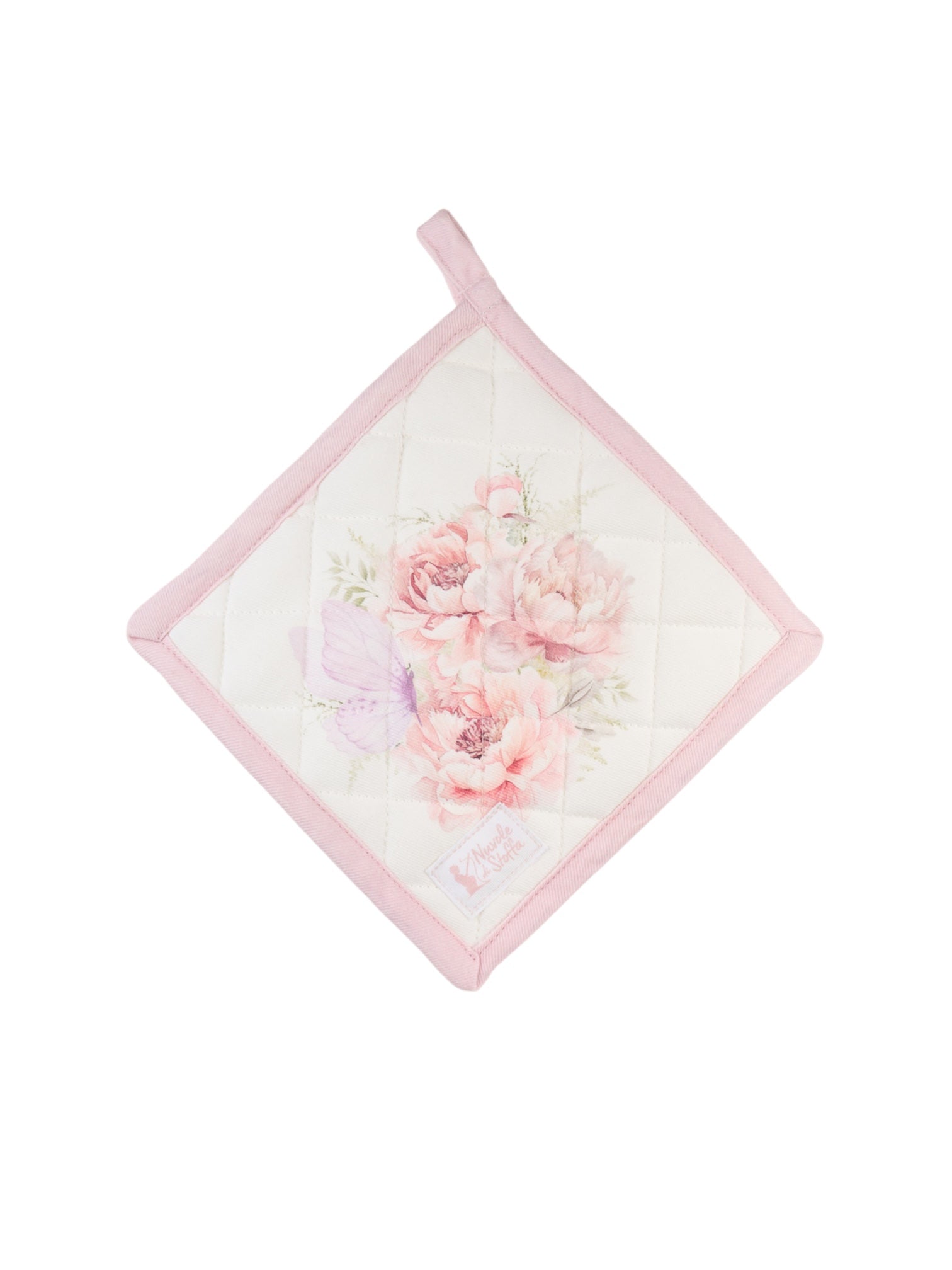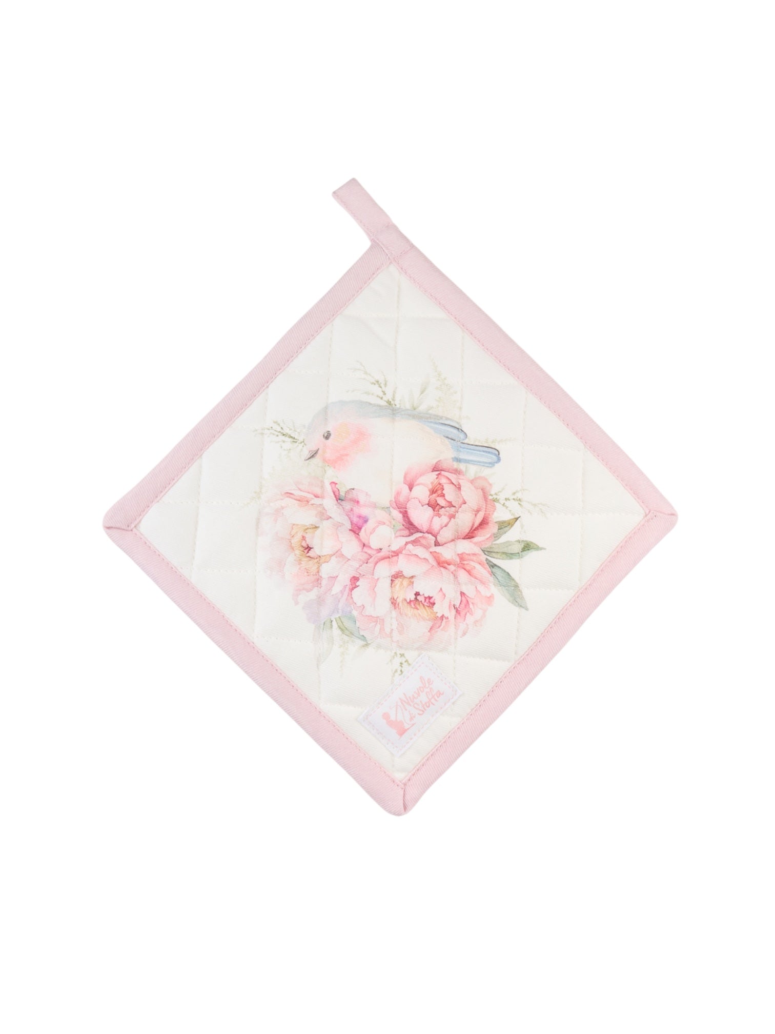 Utilissima presina con stampe di uccellini e peonie con un effetto acquerello, dalle tonalità pastello e dettagli romantici, sui bordi presenta un motivo geometrico su una base di colore avorio. In 100% cotone, assorbente e resistente, ideale per prendere teglie e pirofile dal forno con praticità o da posizionare su dei ganci in cucina per decorarla. Nella parte dietro una fantasia a trama geometrica. Si adatta ad una cucina romantica e shabby ma anche contemporanea.