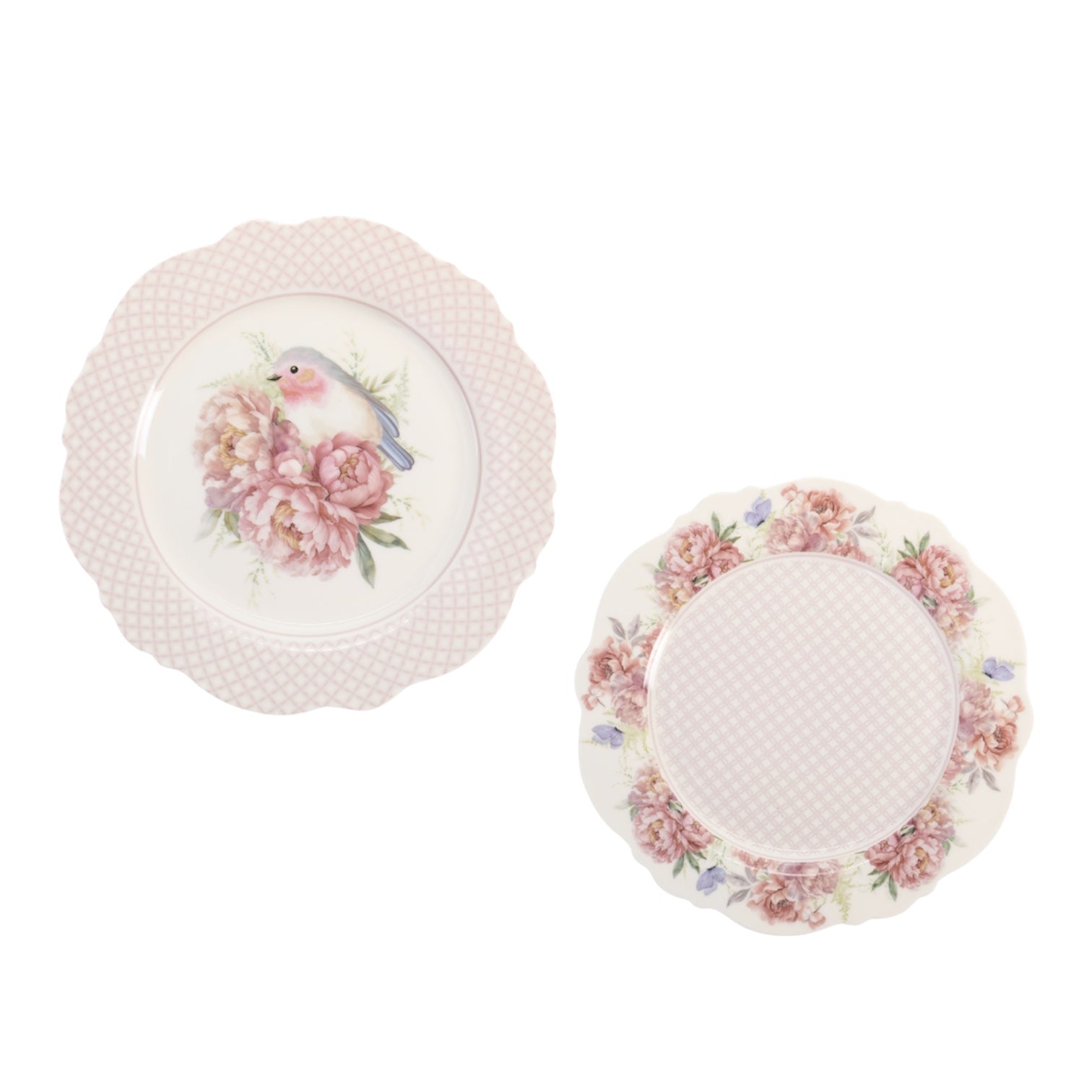 Bellissimo set composto da due piatti da dolce in porcellana dalle tonalità pastello e dettagli romantici, un piattino presenta un cameo formato da un bouquet di rose rosa effetto acquerello con uccellino, un altro piattino invece un bordo ricamato da fiori con una parte centrale con stampa geometrica. Ideale per servire a tavola dei biscottini o una fetta di dolce, oppure per servire della frutta fresca. Possibilità di abbinarli alla teiera e alle tazze della stessa linea. Compresa di box regalo.