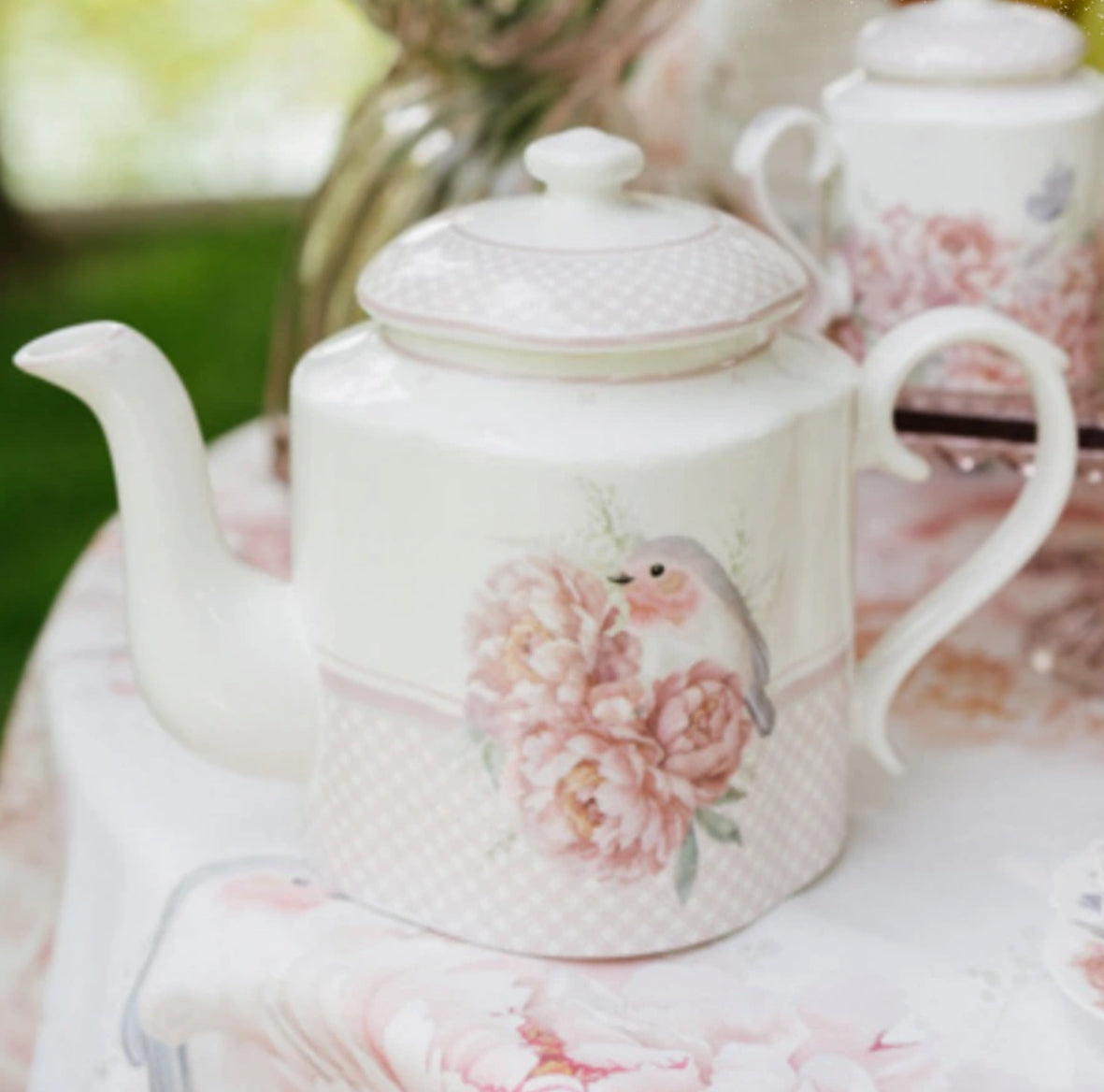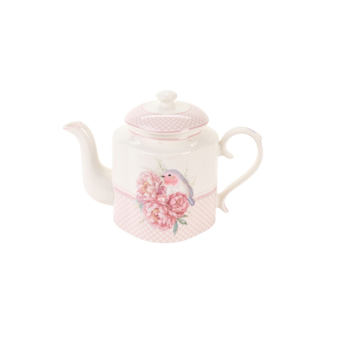 Bellissima teiera in porcellana dalle tonalità pastello e dettagli romantici, presenta un cameo formato da un bouquet di rose rosa con uccellino su una base di colore bianco stampe geometriche sul coperchio e alla base. Ideale per servire un buon tè a tavola per un momento di puro relax che sia da soli o in compagnia, da abbinare alle tazze e piattini della stessa linea. Con scatola regalo a tema