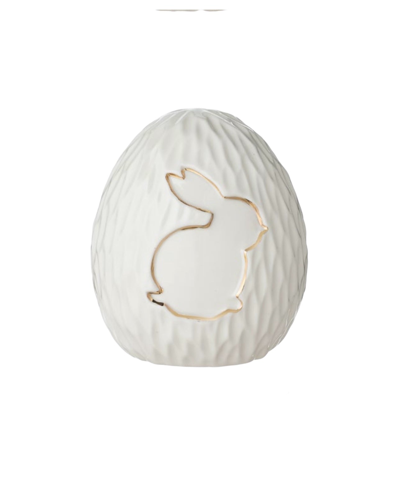 Elegantissimo uovo in ceramica bianco lavorato con decoro di coniglio bianco e dettagli oro. Si adatta a qualsiasi tipo di arredamento dal più moderno a quello contemporaneo. Una perfetta decorazione a tema pasquale.